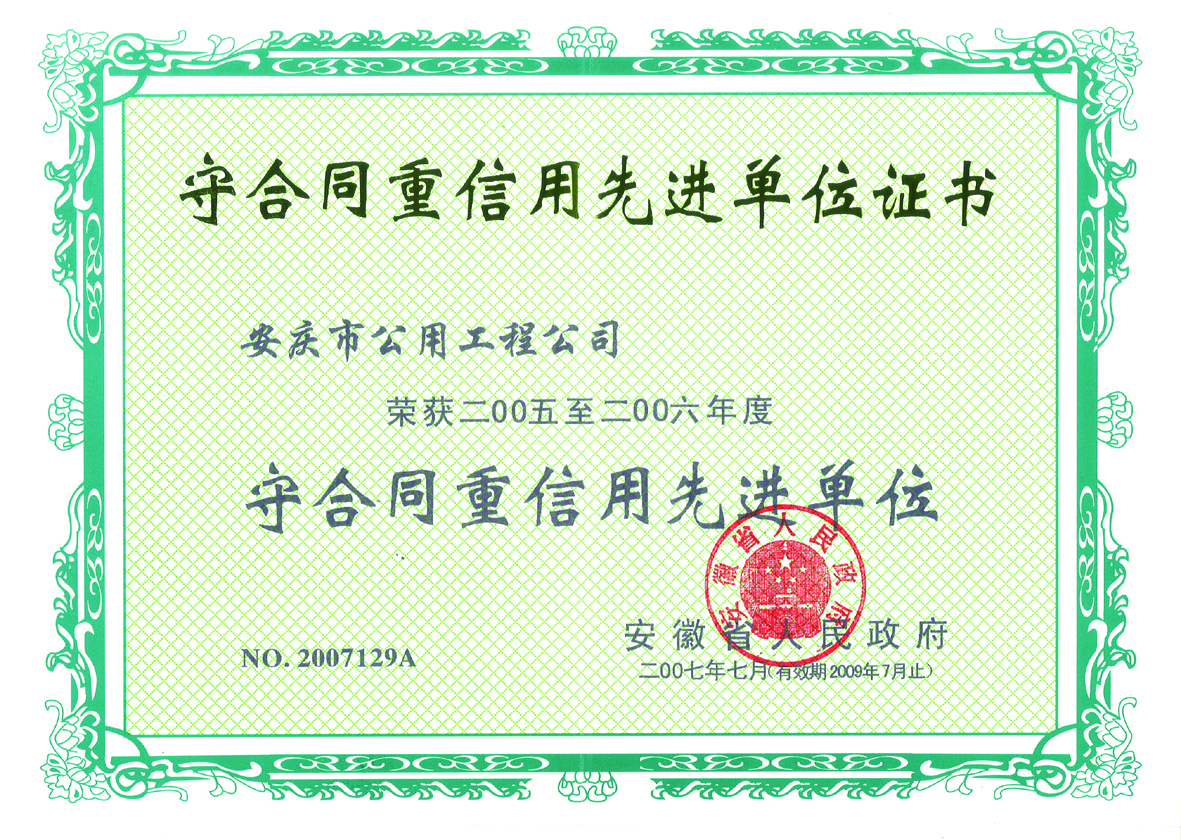 守合同重信用先進(jìn)單位證書(shū)